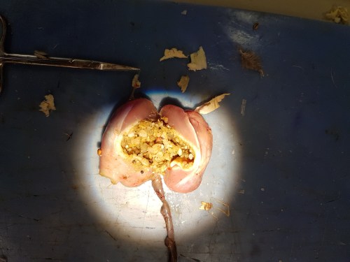 Oh why not, here’s the gizzard/stomach showing its grinding pebbles and bits of food, plus the strong outer muscle layers (pink) for driving that grinding. Small intestine heads toward the bottom of the image. Yes, we do need a better dissection light…