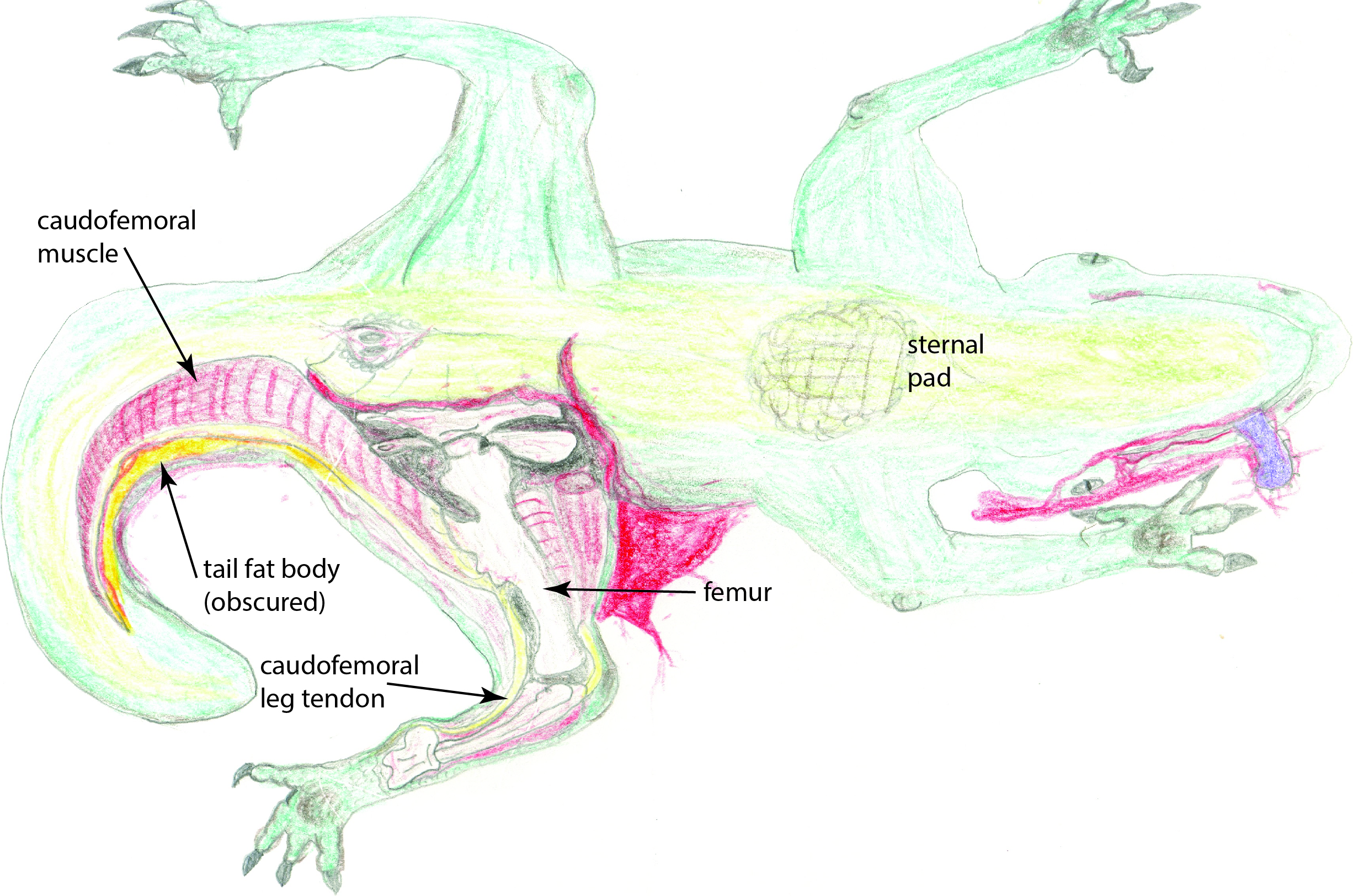 Jawa 37C-H4 sketching droid illustration: My dissection of a common dewback, showing (ventral view) the caudofemoral muscle and tendon, tail fat body (obscured by the nearby muscle), and fibrous pads used while resting on the sand.