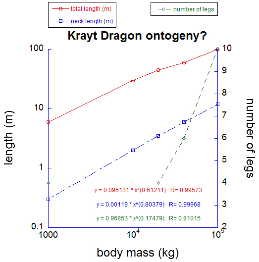 Although based on little concrete data, my analysis of known Krayt and related specimens suggests that they change continuously during ontogeny, although leg number may shift more suddenly (I predict this happens during their first metamorphosis at sexual maturity). Strong allometric scaling of neck and total length is evident- if the two lengths scaled as body mass0.33 they would be maintaining shape across the proposed growth series. But they don’t.