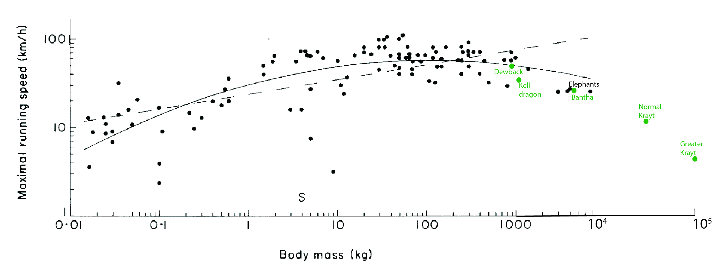 Maximal speed vs. body mass data from (black) Terran animals (source), and (green) Tatooine megafauna (plus non-native Kell dragons for comparison). As size increases past ~100 kg mass (when EMA in the other graph above is already maximal), speed inevitably declines.