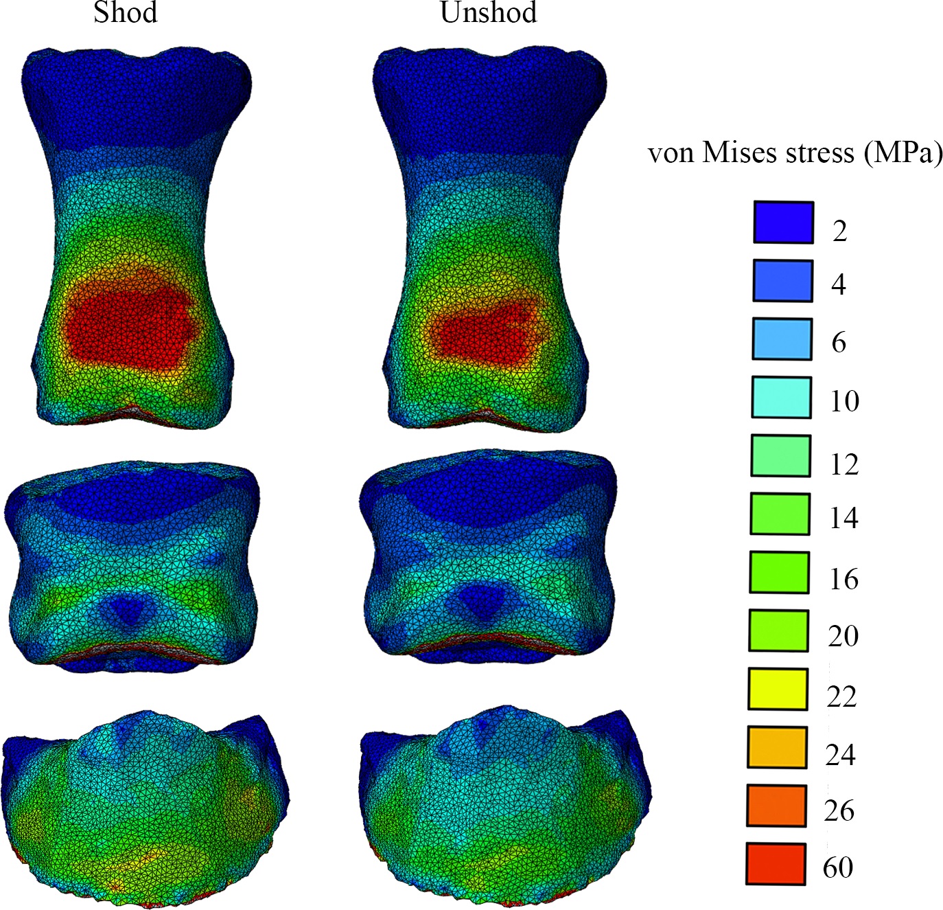 Above: The toe bones (phalanges) of our horse’s forefoot in dorsal (cranial/front) view, from our FEA results, with hot colours showing higher relative stresses- in this case, hinting (but not demonstrating statistically) that wearing horseshoes might increase stresses in some regions on the feet. But more convincingly, showing that we have a scientific workflow set up to do these kinds of biomechanical calculations from experiments to computer models and simulations, which was not trivial.
