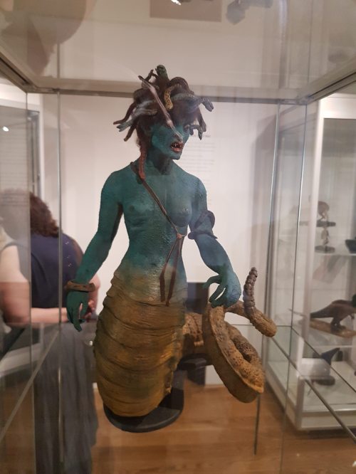 How about a 3D view of a weird sculpture of snaky tentacles and… somebody.
