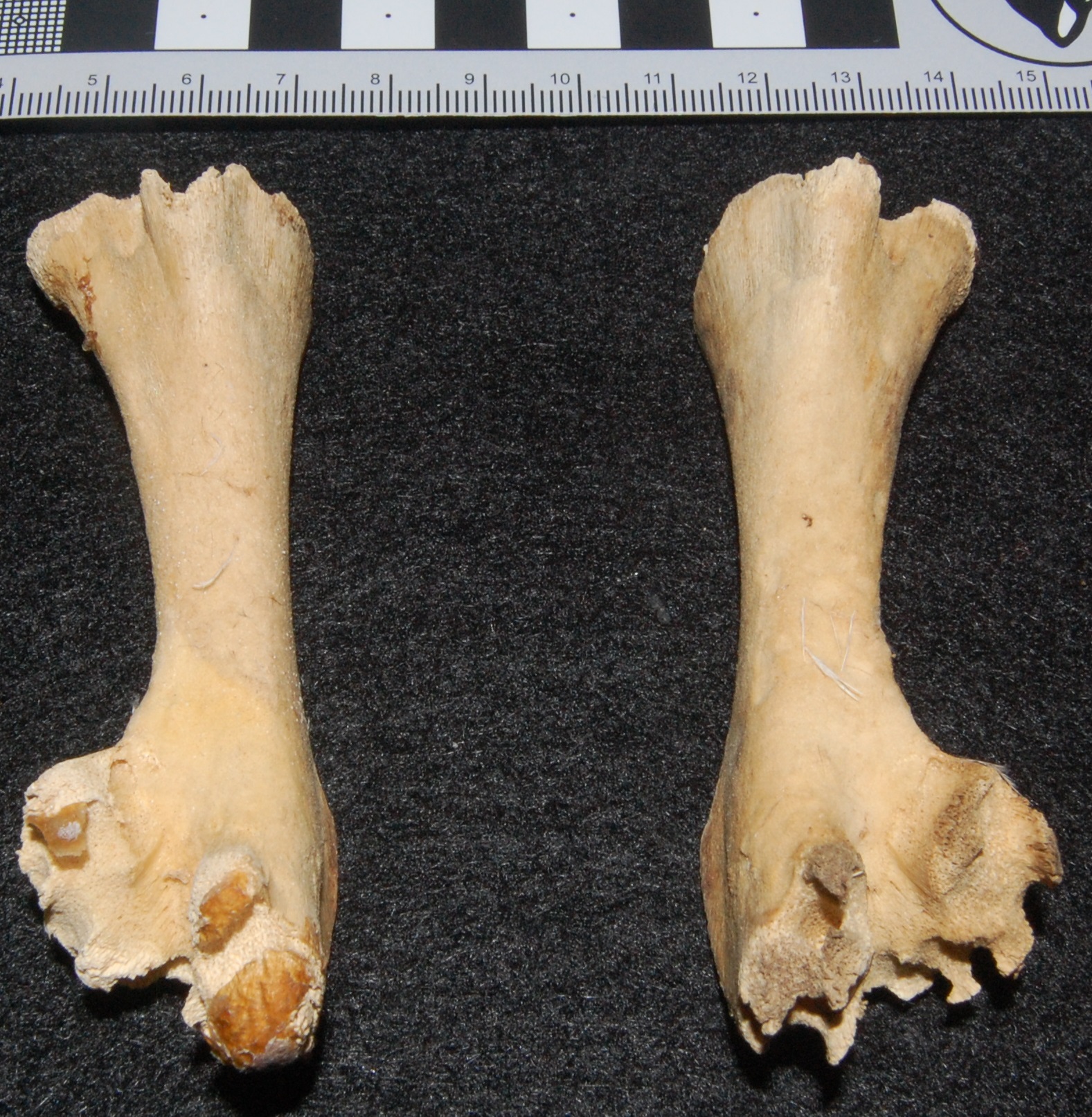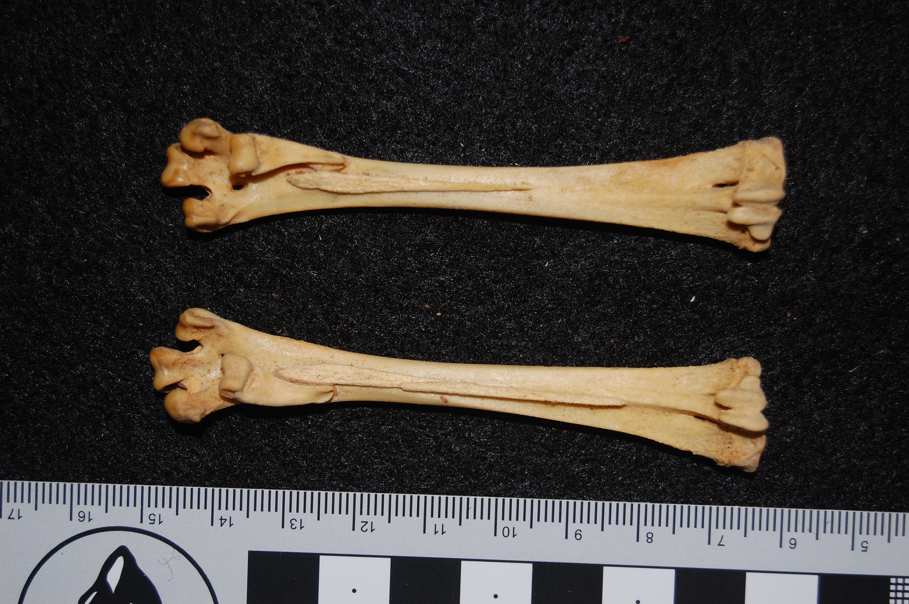 Juvenile kiwi’s shank (tibiotarsus) bones viewed from the top (proximal) ends, showing the bubbly nubbins of bone (very bottom of each bone image; lighter region) that are the “cranial tibial epiphyses” often mistaken for patellae.