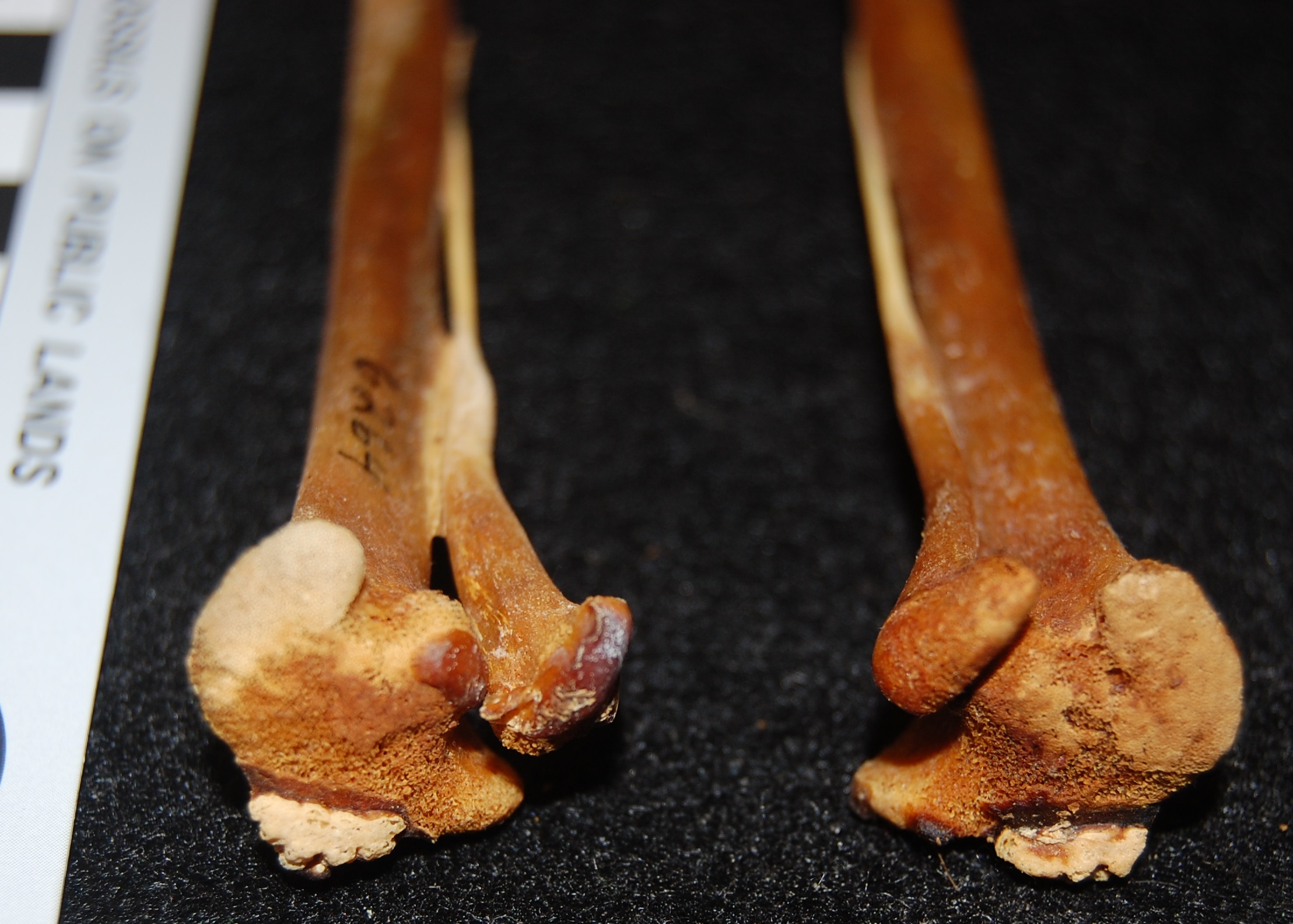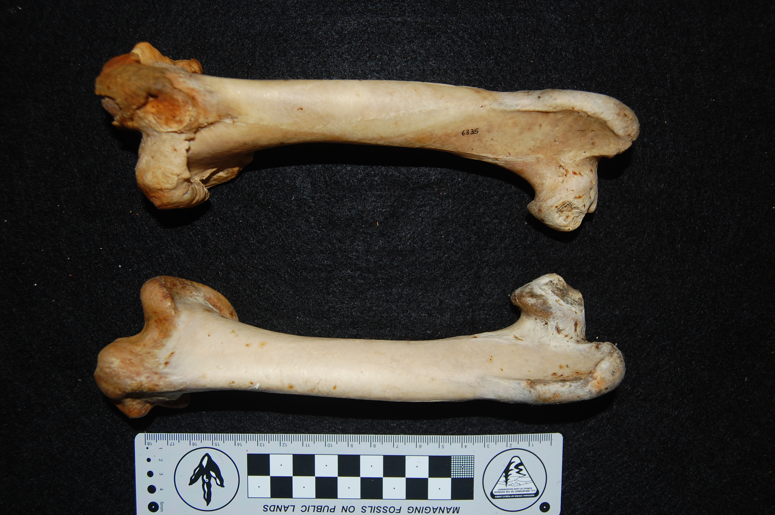 Rhea pennata (Darwin’s rhea) femora; right (top) one with a major pathology on the knee end; overgrown bone (osteoarthritis?). Owie!