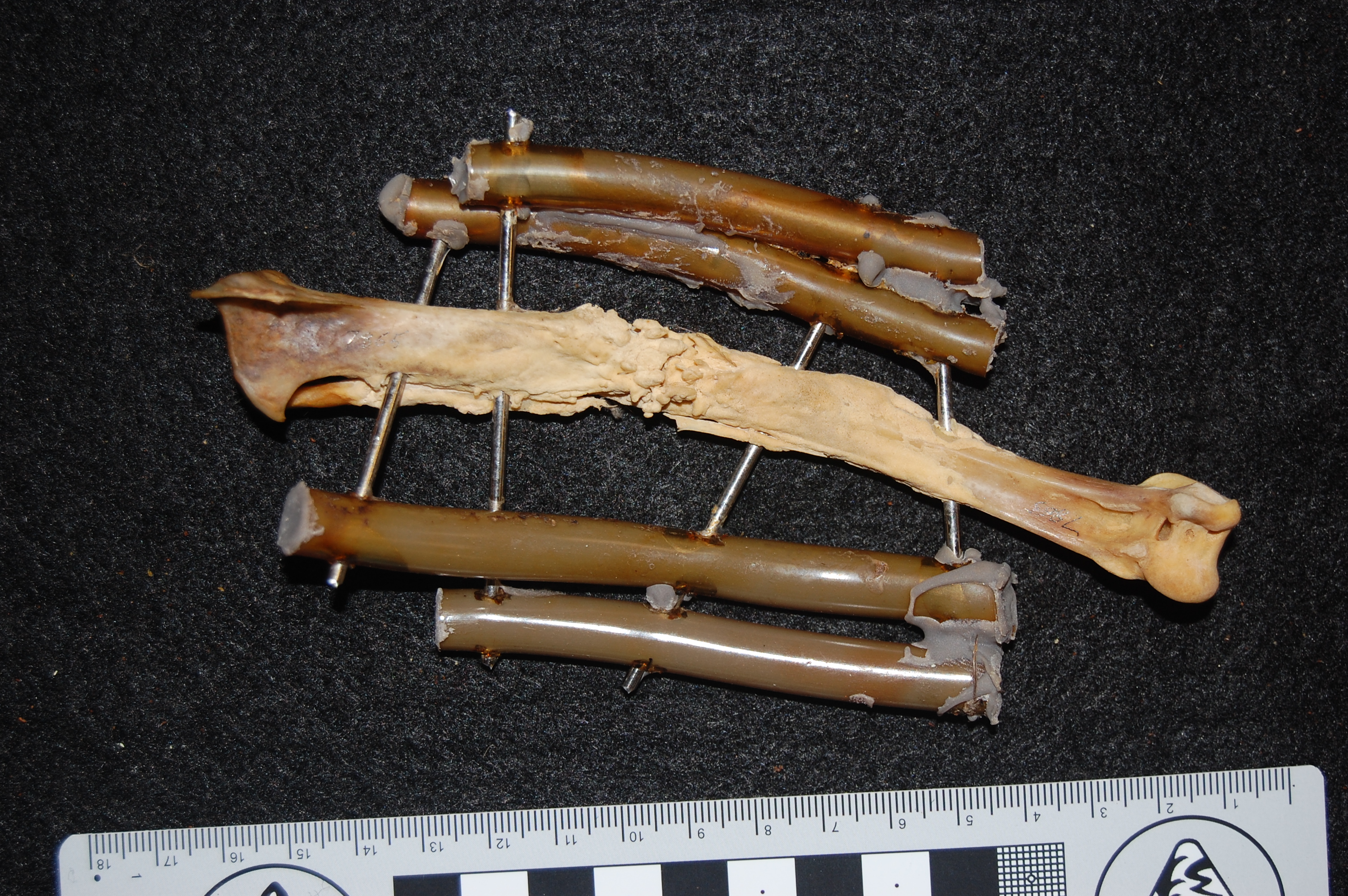 Healed shank (tibiotarsus) bone of the same magpie goose as above. It had its own nightmares! No mystery why this guy died: vet staff at the zoo tried to fix a major bone fracture (bracing it with tubes and metal spars), and it had time to heal (see the frothy bone formation) but presumably succumbed to these injuries/infection.