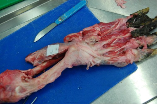 My first encounter with a penguin in the wild (but not a live one) is probably this specimen washed up on a beach in Uruguay. I’m going with the tentative ID of a juvenile penguin skeleton (short foot; flat wing bones); probably Magellanic. The bevy of vertebrate morphologists investigating dead penguins on this beach during our conference in 2010 will not soon be forgotten!