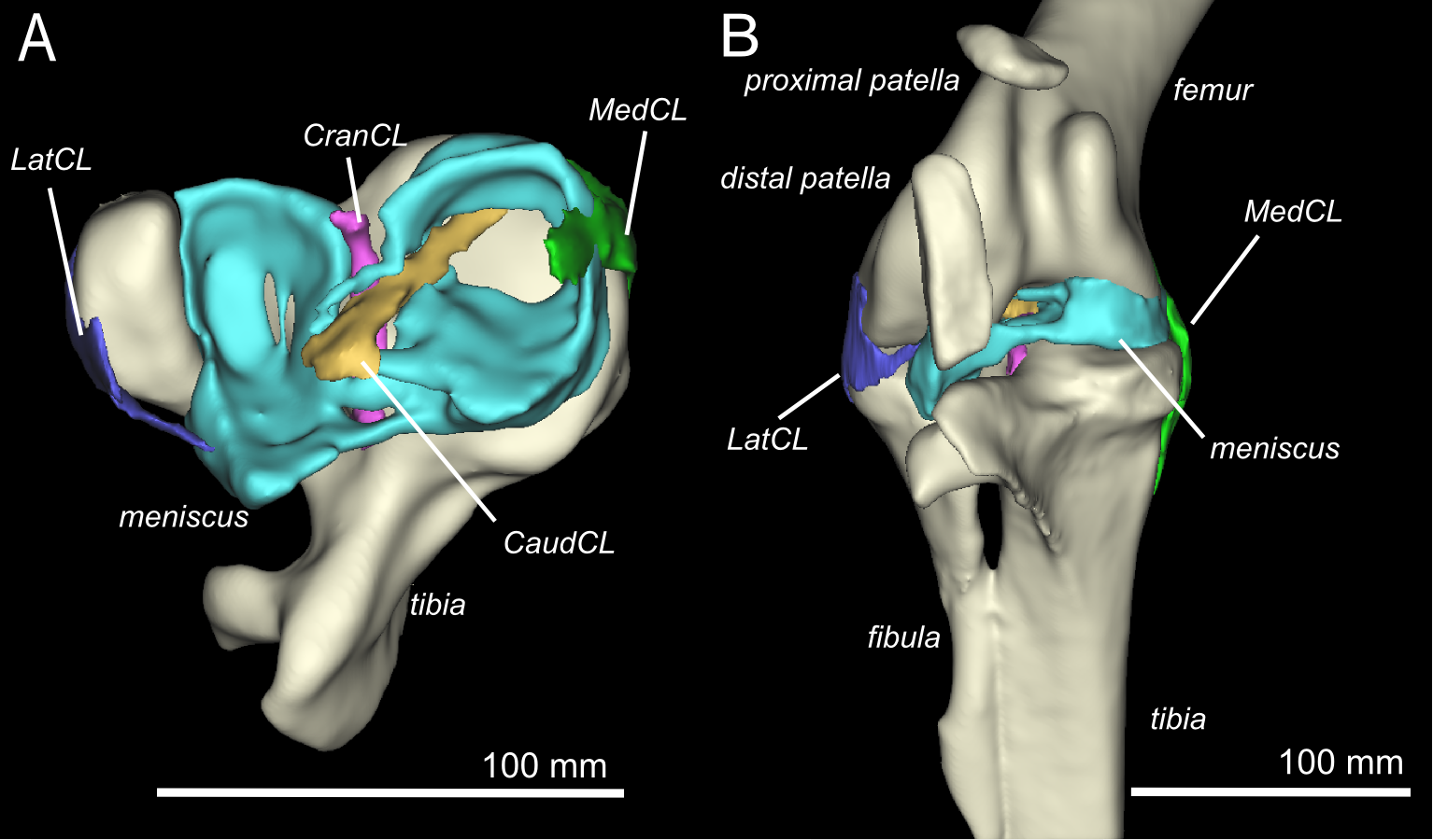 3D model of an ostrich knee, showing: A, View looking down onto the top of the tibia (shank), with the major collateral ligaments (CL), and B, View looking straight at the front of the knee joint, with major organs of interest near the patella, sans muscles.