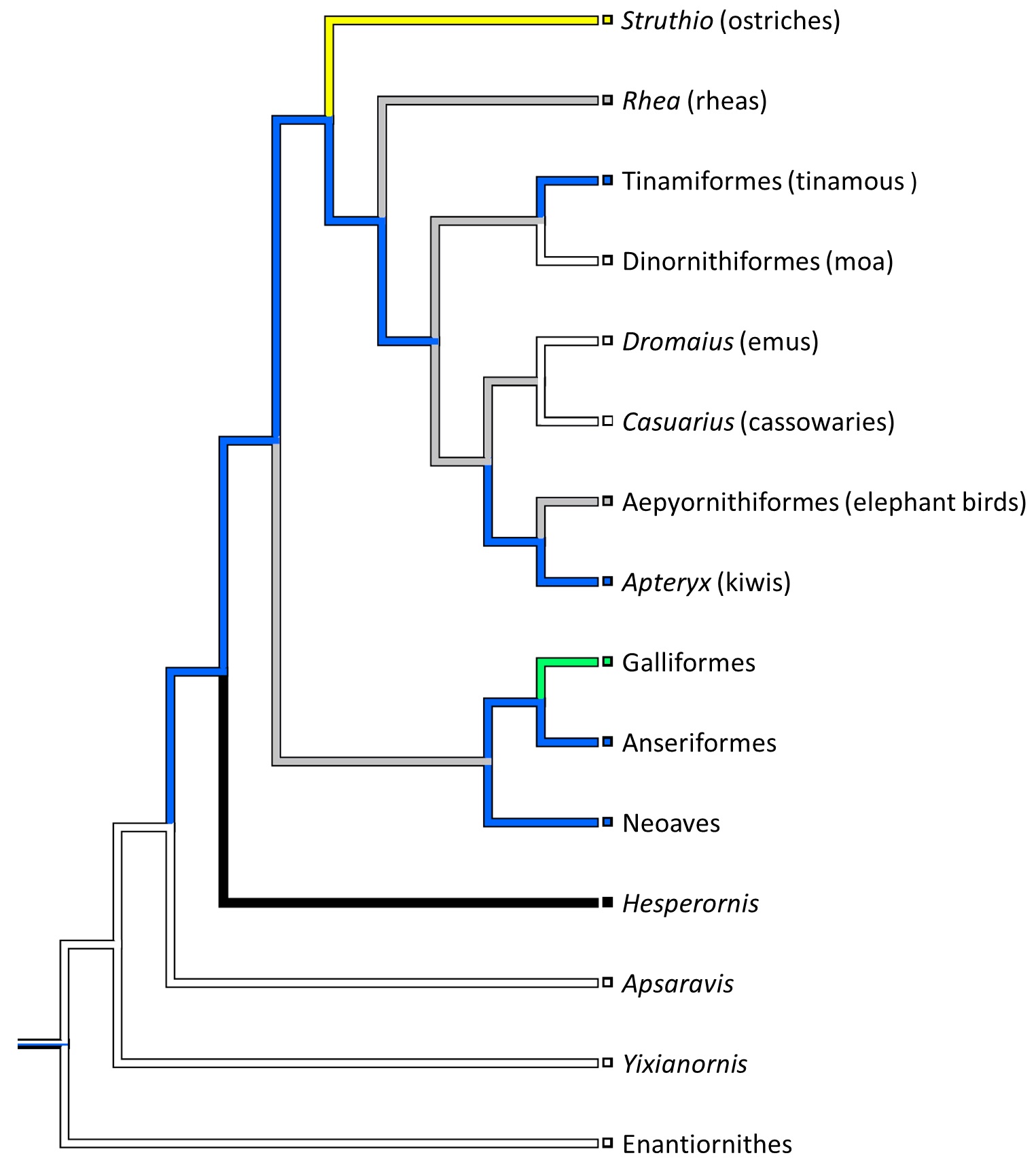 Evolution of patellar form in birds. White branches indicate no patella, blue is a small flake of bone for a patella, green is something bigger, yellow is a double-patella in ostriches, black is a gigantic spar of bone in extinct Hesperornis and relatives, and grey is uncertain. Note the uncertainty and convergent evolution of the patella in ratite birds (Struthio down to Apteryx), which is remarkable but fits well with their likely convergent evolution of flightlessness and running adaptations.