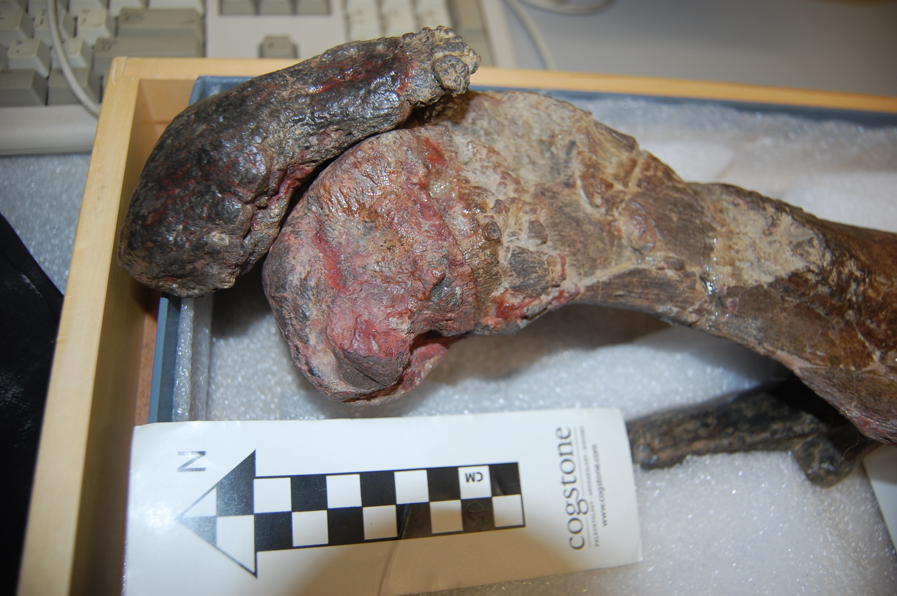 A large duckbill dinosaur’s left leg, with a red line drawn in showing roughly where the CFL would be running, to end up at the fourth trochanter. Many Mesozoic dinosaurs have skeletal anatomy that indicates a similar CFL muscle.
