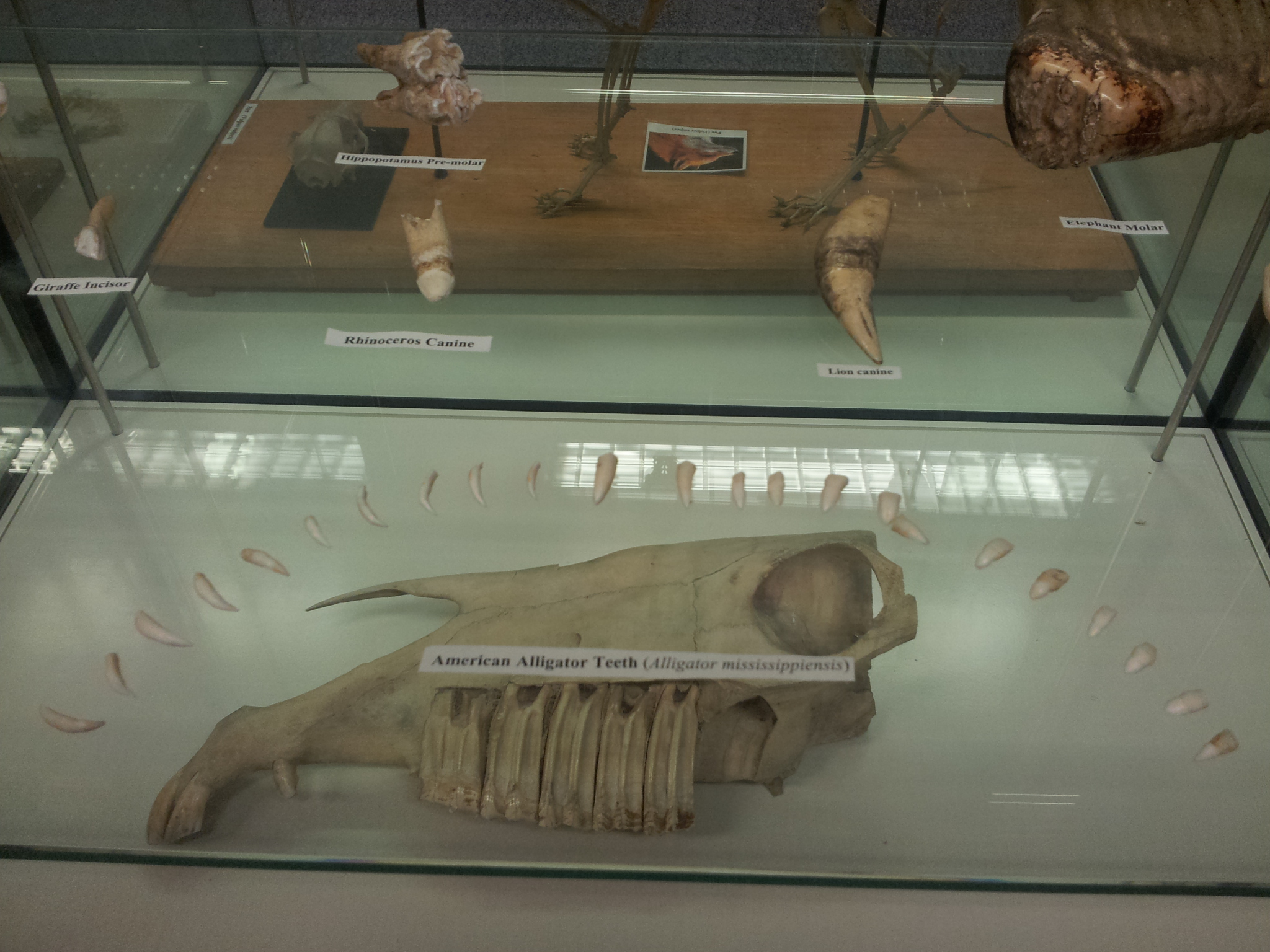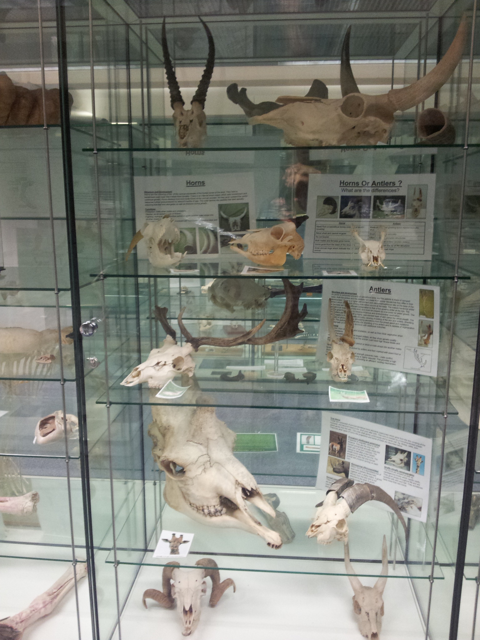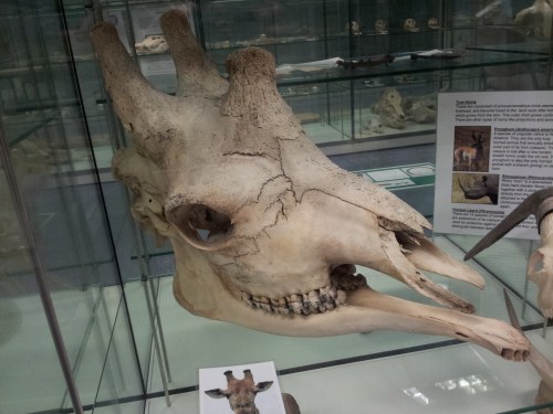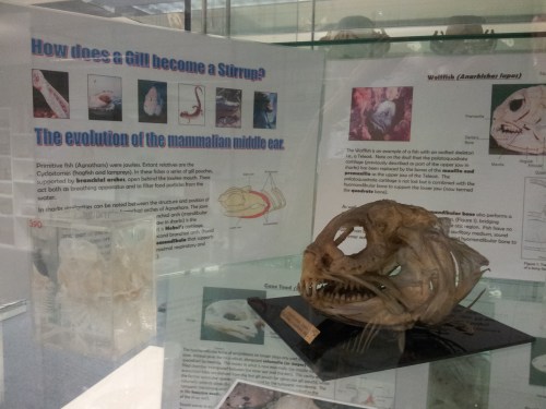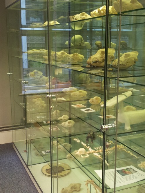 Passing the sharks, we come to one of several thematic sections about body systems, this first one on the skeleton (later, brain/nerves, circulation, muscles, etc.). A few small skeletal specimens of the type that are seen throughout the museum are presented, with a scallop reminding us that skeletons can come in many types among multicellular organisms. There is a horse skull and a stark white whole skeleton of a young-ish ostrich, which was very nicely mounted. However, I was caught off guard by the pelvis, which lacked the curved, ventral “boot” like connection of the pubic bones that ostriches have—presumably explained by its juvenile status although I wasn’t 100% sure it was even an ostrich pelvis. OK, I am having a serious pelvis-nerd moment here; forgive me as my PhD was on this stuff.