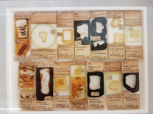 Toward the back of the first corridor of specimens and cases, there is a stunning scarlet haze outlining the body of a “shark” (species not given) with its huge liver lying below it. The haze, a technique used repeatedly throughout the exhibit, is some kind of corrosion cast of the circulatory system, I gather. A bunch of cross/longitudinal sections of cephalopods, crocodiles, fish, horse hooves and other animals decorate blank spaces on the walls, some with labels showing basic features and some just hung like paintings. Fair enough, but a missed opportunity for a bit more educational content here.