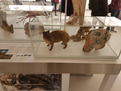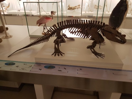 BUT, once again the small interpretive panel had a moment of Fail. The ostrich was explained to have two toes, in contrast to normal birds which have “five”. HUH? Birds have three main toes and variably also a fourth, inner (first) toe called the hallux, used for perching and other activities including walking. None have a fifth toe; indeed their dinosaurian forebears lost that feature some 230ish million years ago. Just an embryonic vestige of the base of the fifth toe is visible in bird embryos today. Furthermore, the panel said that two toes in ostriches can grip the ground more strongly than more toes in other birds. I know of no evidence that shows this, and suspect that the contrary might be true. The standard explanation for toe reduction in ostriches is that it is a lightening feature characteristic of “cursorial” (long-legged, sometimes fleet/efficient) animals, to make swinging the long legs easier. These errors really should have been caught by involving experts in polishing the scientific content of the exhibit.