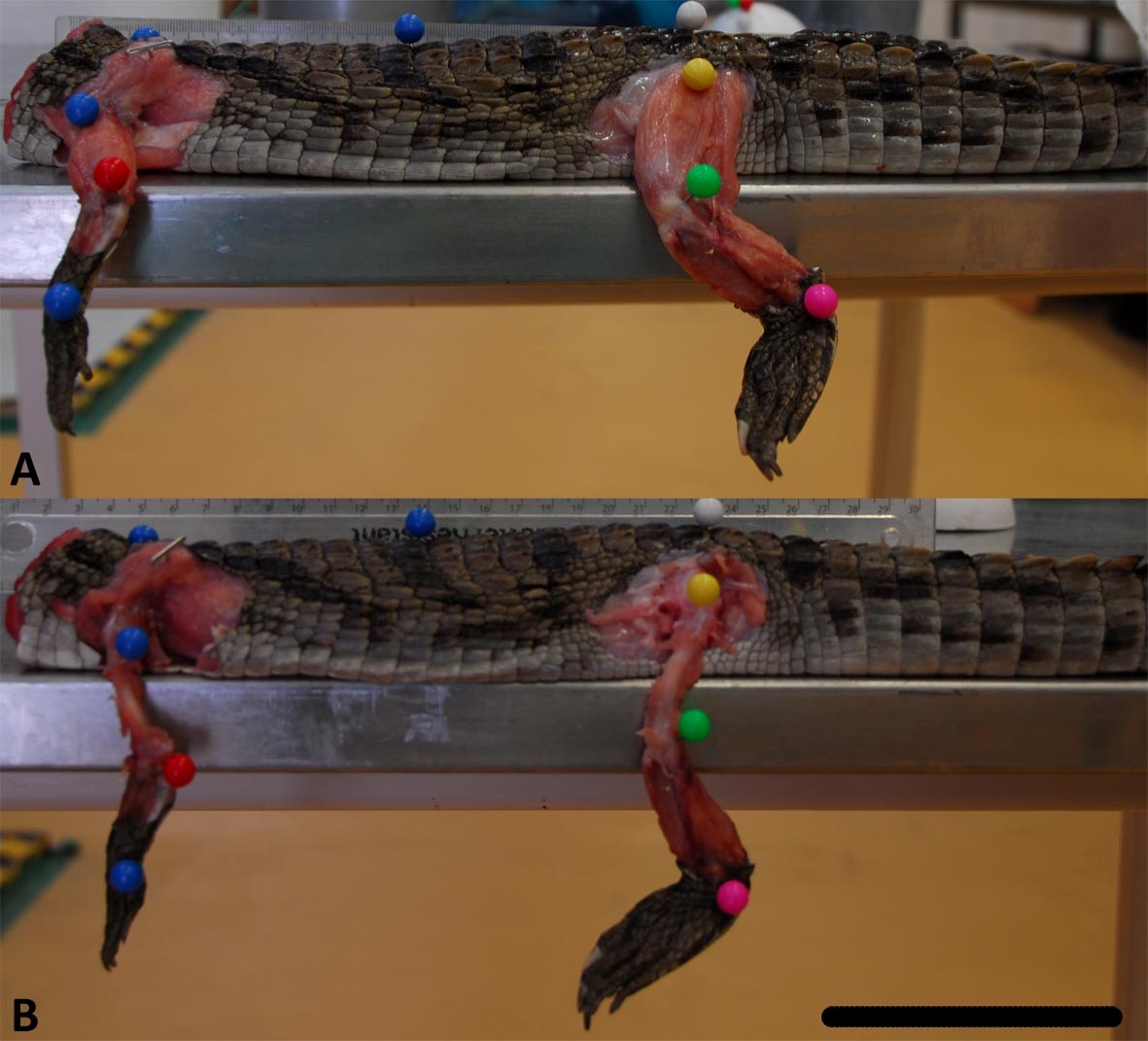 We observed that the simulations did clever things with the tail, swinging it side-to-side (and up-down) with each step in 3D; and in-phase with each leg: as the leg moved backward, the tail moved toward that leg’s side. With deeper analyses of these simulations, we found that this tail swinging conserved angular momentum and thus mechanical energy; making locomotion effectively cheaper, analogous to how humans swing their arms when moving. This motion emerged just from the physics of motion (i.e., the “multi-body dynamics”); not being intrinsically linked to muscles (e.g. the big caudofemoralis longus) or other soft tissues/neural control constraints (i.e., the biology). That is a cool finding, and because Coelophysis is a fairly representative theropod in many ways (bipedal, cursorial-limb-morphology, big tail, etc.), these motions probably transfer to most other fully bipedal archosaurs with substantial tails. Curiously, these motions seem to be opposite (tail swings left when right leg swings backward) in quadrupeds and facultatively bipedal lizards, although 3D experimental data aren’t abundant for the latter. But then, it seems beavers do what Coelophysis did?
