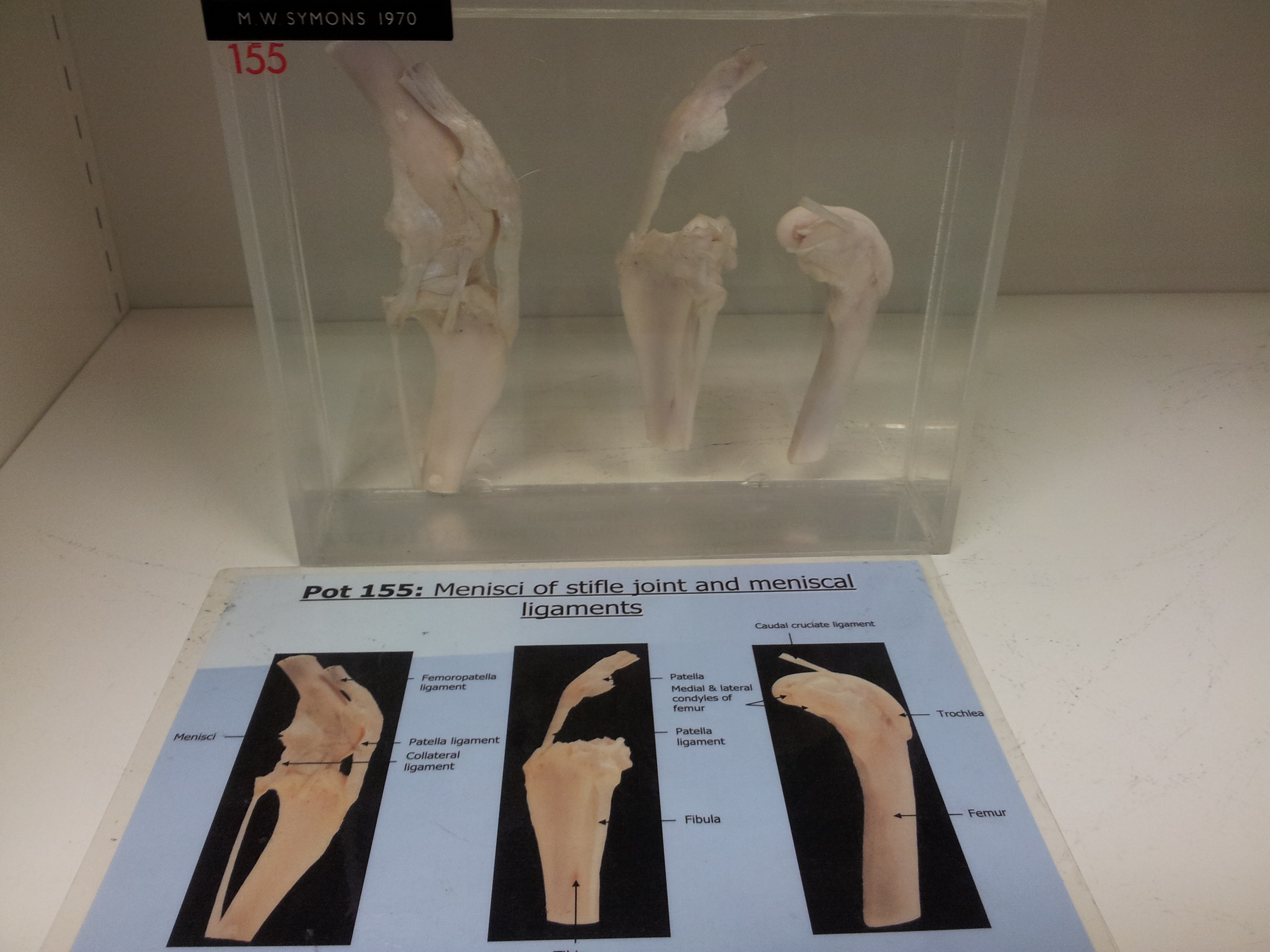 During my brief perusal of the exhibits the other day, I realized I had never shared our nice knee joint dissection in my post on those specimens, nor had I included it in my knotations about knee joints. This is particularly egregious as I am now doing a year-long fellowship/sabbatical to study knee joints, in particular the patella (kneecap) of birds. Here, a dog, with helpful labels of the anatomy around the stifle: