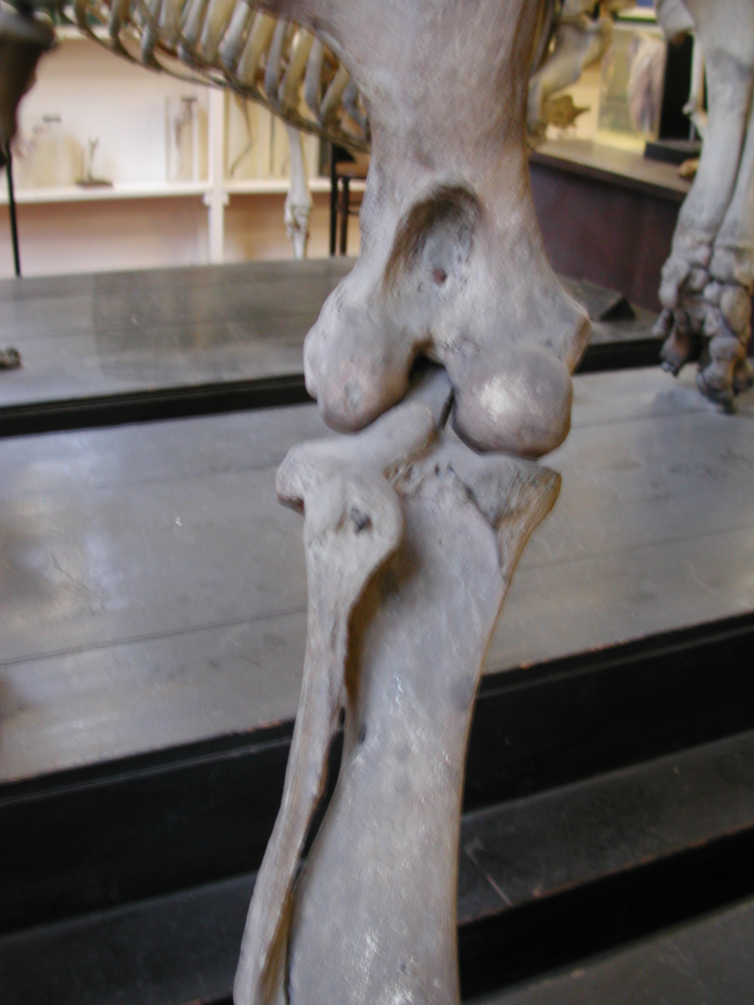 The RVC does not have a mounted giraffe skeleton but I can show you the knee from our dissections, now nice and tidy (note the absence of a fibula, reduced to a small tarsal (ankle) bone in many artiodactyls– but not pigs or hippos as you can see above; what consequences this change has for knee joint mechanics is entirely unknown! However, the fibula has such a small/nonexistent connection to the femur/knee joint in many large mammals that the consequences may be negligible; who knows.):