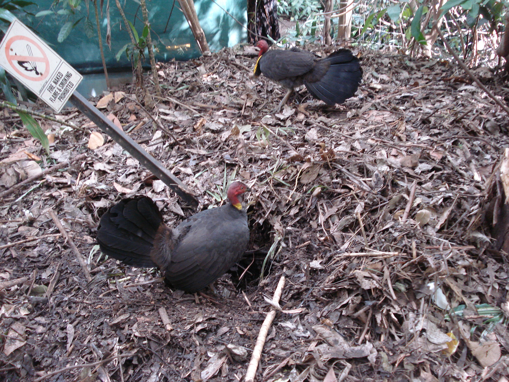 Australian brush-turkeys, Alectura lathami, at the Alma Park Zoo near Brisbane, Australia; they run wild there. Here they are doing what they are best known for: making a mound-like nest. We were doing kangaroo biomechanics experiments and they were everywhere. I was in awe to see such exotic (to me) birds; locals seemed not so enthused (the birds are loud and make a lot of mess).