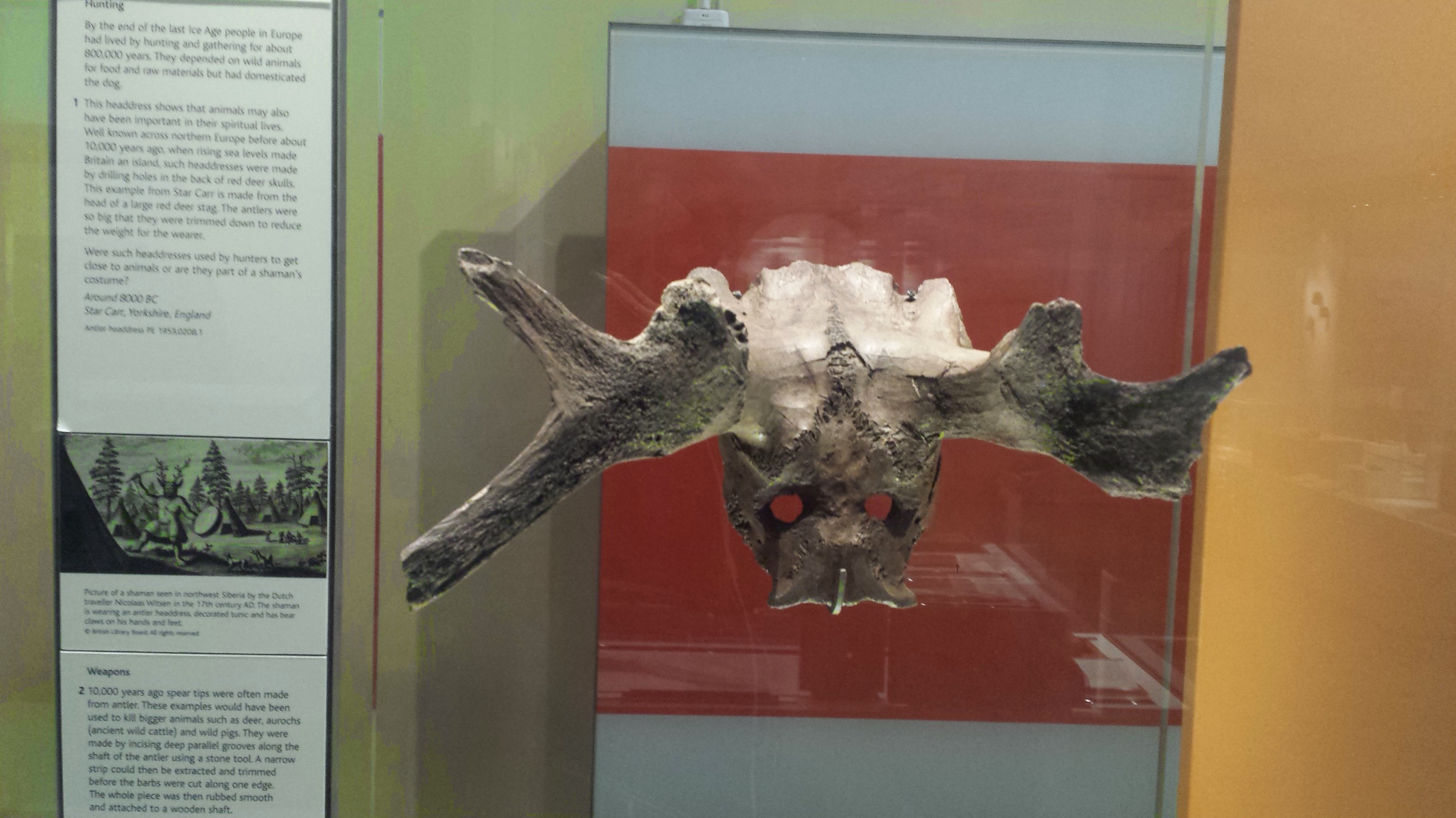 ~8000 BC red deer antler headdress from England (click to enstaggen for closer examination and text details).