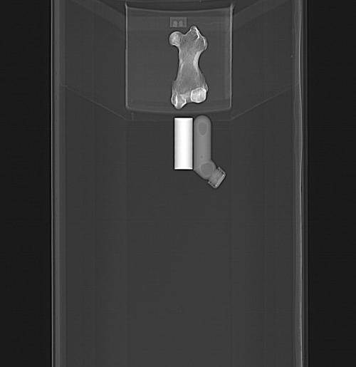 This time with a pilot (or scout) scan of an odd object. A pilot/scout scan is a quick, low exposure scan used to plan a series of CT slices, which shows a a larger area that is then narrowed down to focus just on the object of interest and a bit of buffer room for those slices. It generally isn’t used for much else, but sometimes can make a neat picture. As you can see here, the pilot scan area was excessively massive relative to the object. The two odd objects below the primary object of interest are scanning phantoms, used to calibrate density from Hounsfield units to actual real-world density (one is water at 1 g/cm3; the other is “cortical bone” at 1.69 g/cm3). Ignore them.