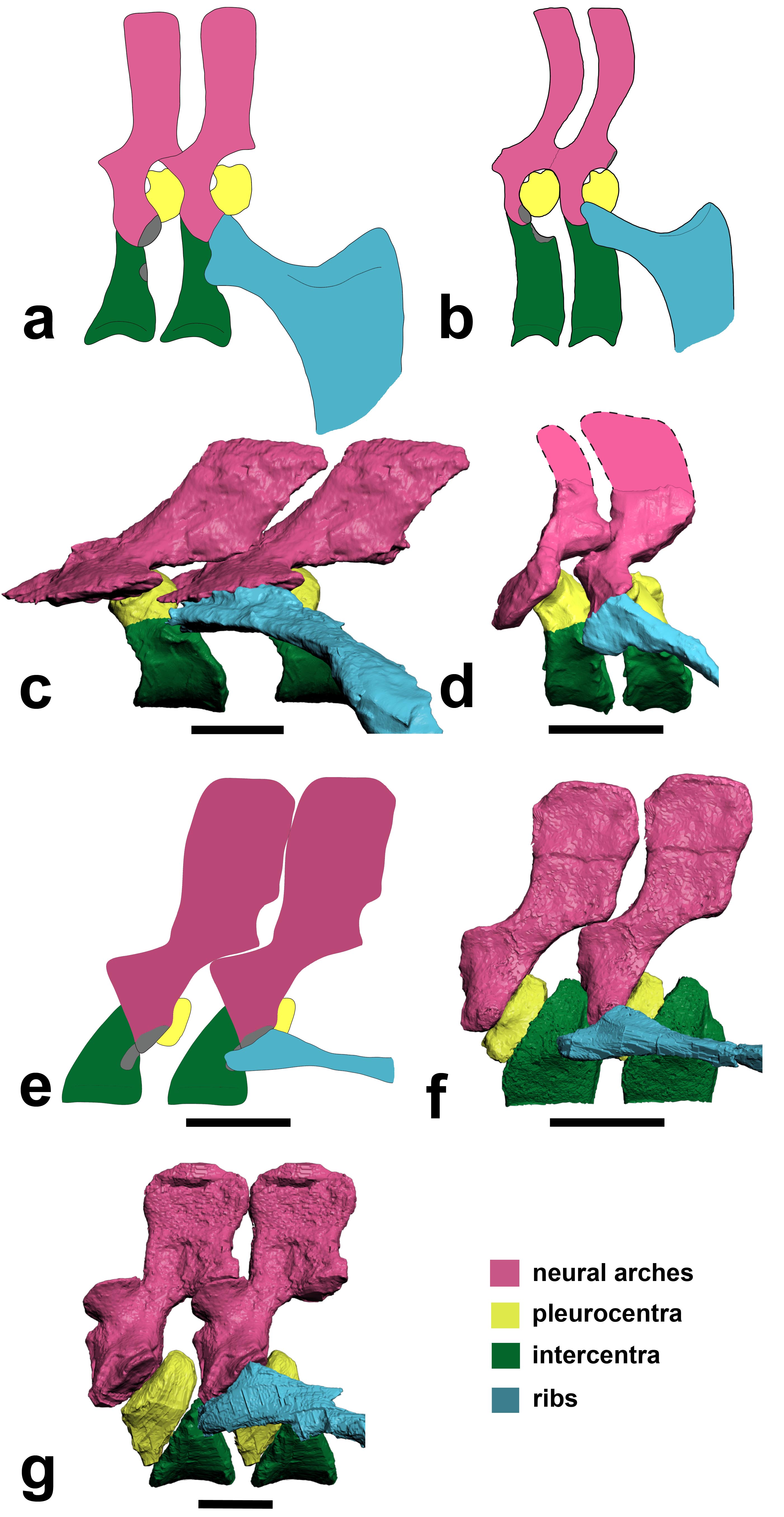 Using this new technology, the team of scientists discovered that what was thought to be the first bone – known as the intercentrum – is actually the last in the series. And, although this might seem like a trivial oversight, this re-arrangement in vertebral structure has over-arching ramifications for the functional evolution of the tetrapod backbone.(see here for a now out-of-date image from Wikipedia)